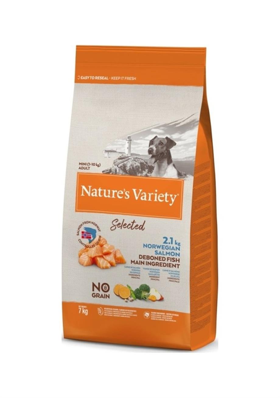 Natures Variety Dog No Selected Mini Adult Norwegian Salmon 7 kg, küçük ırk yetişkin köpekler için somon balıklı tahılsız mamadır. Küçük boyutlu taneleri kolay çiğneme sağlar. Sindirimi destekleyen doğal içerikler ve omega yağ asitleriyle sağlıklı cilt ve tüy yapısını korur.